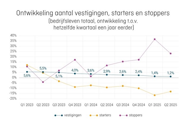 In het tweede kwartaal van 2025 signaleert de Kamer van Koophandel (KVK) opnieuw een stijging van het aantal stoppende vestigingen (hierna genoemd 'stoppers'). Samen met een daling van het aantal startende vestigingen (hierna genoemd 'starters'), neemt hiermee de groei van het aantal vestigingen al twee jaar af. Op 30 juni 2025 stonden er 2.588.747 vestigingen ingeschreven in het KVK Handelsregister. Dit is een lichte stijging van 1,2% ten opzichte van het tweede kwartaal van 2024 en het laagste groeicijfer in de afgelopen tien jaar. Opvallend is dat de startende ondernemer steeds vaker voor een BV kiest.