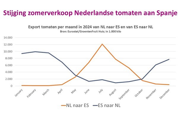 Nederland levert van jaar op jaar vooral in de zomer meer tomaten aan Spanje, de grootste Europese tomatenproducent. De zomers in Spanje worden steeds warmer en duren langer. Dit heeft gevolgen voor de Spaanse tomatenteelt waardoor Spanje meer tomaten in de zomer gaat importeren, zo meldt Wilco van den Berg van GroentenFruit Huis.
