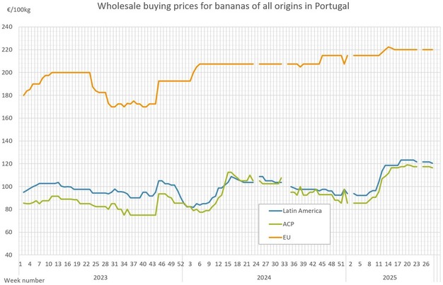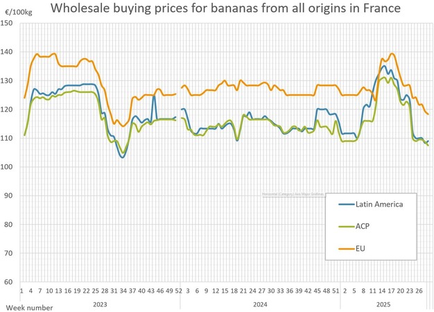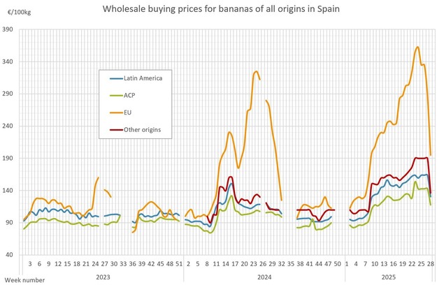 In de week die eindigde op 13 juli 2025 (week 28) vertoonden de gemiddelde groothandelsprijzen voor ACP-bananen (Afrika - Caribisch gebied - Pacific) in verschillende Europese landen opvallende verschuivingen ten opzichte van de voorgaande week, volgens de meest recente marktgegevens.