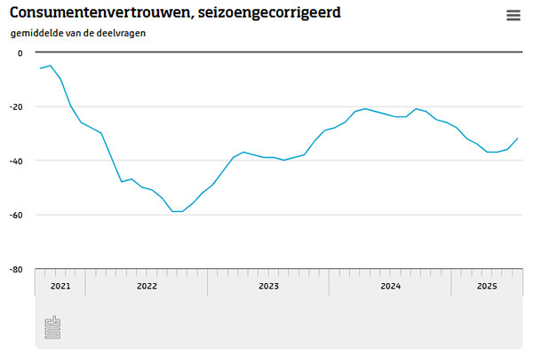 Met -32 lag het consumentenvertrouwen in juli onder het gemiddelde over de afgelopen twintig jaar (-10). Het vertrouwen bereikte in januari 2000 de hoogste stand ooit (36) en in september en oktober 2022 de laagste stand ooit (-59). Het CBS meet het consumentenvertrouwen elke maand sinds april 1986 op basis van het consumentenconjunctuuronderzoek. Het consumentenvertrouwen is een gemiddelde van 5 deelvragen, waarbij van elke vraag het saldo van positieve en negatieve antwoorden wordt genomen. Als alle consumenten positief zijn, is het saldo 100. Als alle consumenten negatief zijn, is het saldo -100.