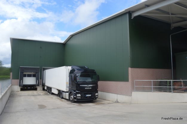 De sorteer- en opslaghal, die in 2021 in gebruik is genomen en onder andere is uitgerust met een ammoniakkoelsysteem en zonnepanelen. Door de vacuümkoeling heeft het bedrijf een hoog elektriciteitsverbruik, maar de helft daarvan wordt gedekt door de zonnepanelen, legt Stoffers uit.