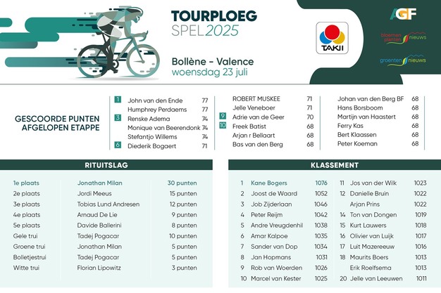 De sprint werd gisteren gewonnen door Jonathan Milan, maar de dagzege van de Takii Tourploeg werd bloemrijk gewonnen door John van den Ende (VG Orchids) en Humphrey Perdaems (Plants & Flowers Foundation Holland). Zij mogen zich net als de eerdere winnaar Don van Geest melden bij [email protected] met hun gegevens om een bidon van sponsor Takii toegestuurd te krijgen.