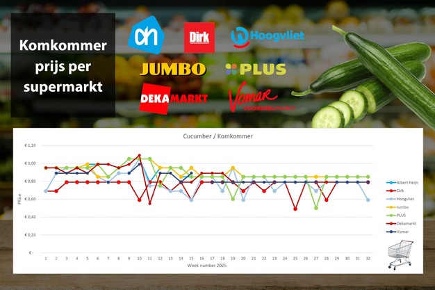Zeer weinig schommelingen in het komkommerschap gedurende de zomerweken. Sinds onze laatste update van week 29 zijn er vrijwel geen veranderingen in de prijzen van komkommers geweest in de onderzochte supermarkten. Enkel Hoogvliet heeft besloten om in week 32 een komkommer in de aanbieding te zetten (-20 eurocent), waardoor deze nu voor 59 eurocent verkopen.