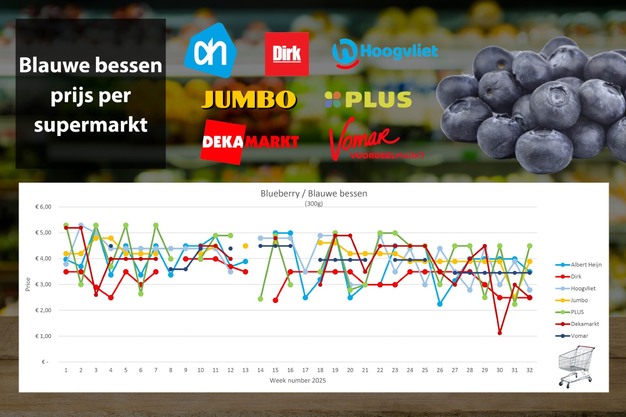 Verrassende wendingen in het blauwe bessenschap, waar Plus in week 29 de prijzen nog flink liet kelderen, zijn deze inmiddels weer terug op 4,49 euro. Een totaal ander beeld zien we bij DekaMarkt, waar er sinds week 29 2 euro van de prijs afgehaald is en ze nu voor 2,49 euro verkopen. Verder blijven de prijzen bij de supermarkten relatief stabiel en hebben Dirk en Hoogvliet besloten de blauwe bessen in de aanbieding te zetten.