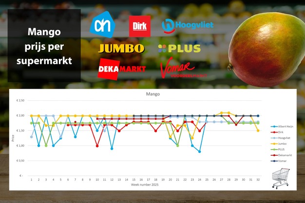 Hoe wispelturig de blauwe bessenprijzen zijn geweest in de afgelopen weken, zo stabiel zijn de mangoprijzen. Sinds de laatste update in week 29 zijn er vrijwel geen veranderingen te zien in de prijs bij alle supermarkten. Enkel Jumbo heeft besloten de mango in de aanbieding te zetten voor 1,50 euro.