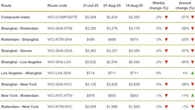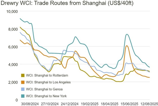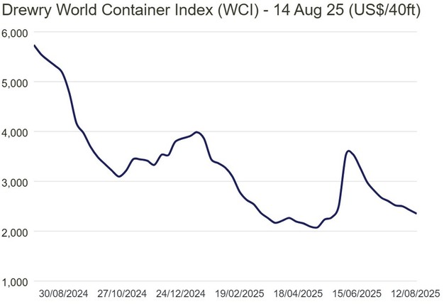 Na een periode van volatiliteit is de World Container Index (WCI) van Drewry voor de negende achtereenvolgende week gedaald, wat duidt op een mogelijke stabilisatie. De onrust begon met de Amerikaanse tariefsmededeling in april, die leidde tot een sterke stijging van de tarieven van mei tot begin juni. Hierna volgde een scherpe daling tot medio juli, waarna het tempo van de daling aanzienlijk afnam.