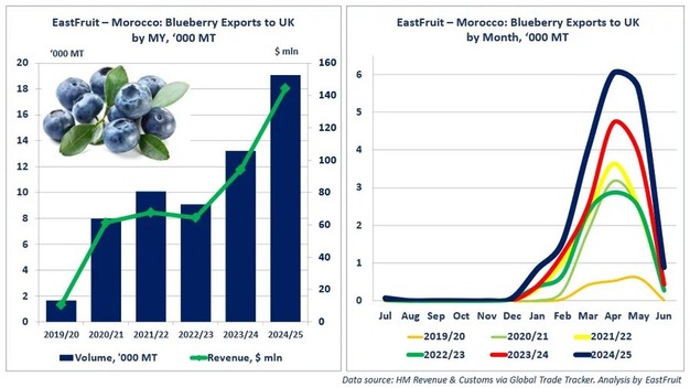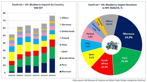 Het VK is momenteel een van Marokko's belangrijkste exportmarkten voor blauwe bessen, naast Spanje en Nederland. Het Marokkaanse seizoen loopt van december tot juni, met piekvolumes in april. In deze periode zijn Spanje, Nederland en Duitsland de voornaamste concurrenten van Marokko op de VK-markt.