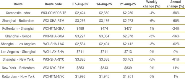 De World Container Index (WCI) van Drewry is dit jaar voor de tiende week op rij gedaald en heeft zich nu gestabiliseerd na een periode van schommelingen. Deze instabiliteit begon na de aankondiging van de Amerikaanse tarieven in april, wat leidde tot een stijging van de transporttarieven van mei tot begin juni. Vervolgens was er een scherpe daling tot midden juli, waarna de neerwaartse trend vertraagde.