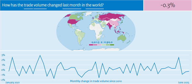 • Het wereldhandelsvolume is in juni 0,3% afgenomen ten opzichte van mei, volgend op een daling van 0,4% in mei (initiële schatting: -0,9%). De ontwikkeling in 2025Q2 was 0,5% (1,9% in 2025Q1).