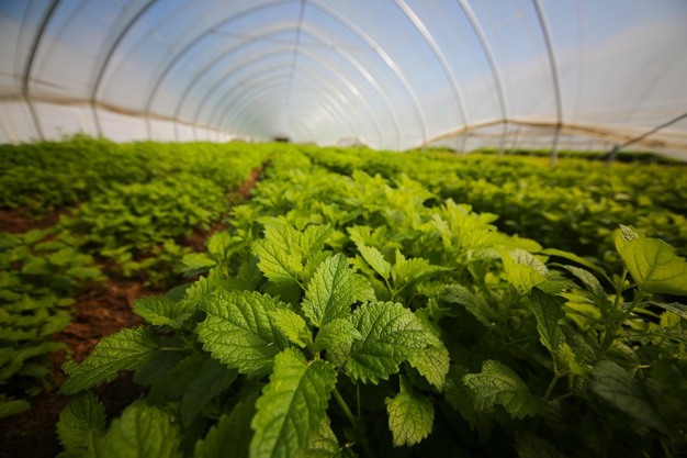 © Dreesen Kräuter Eind april kon de eerste Duitse bieslook uit de vollegrond al worden aangeboden. De oogst in de vollegrond eindigt geleidelijk vanaf eind september, waarna het bedrijf overstapt op geïmporteerde producten uit Zuid-Europa en Oost-Afrika. Op de foto citroenmelisse in de folietunnel.