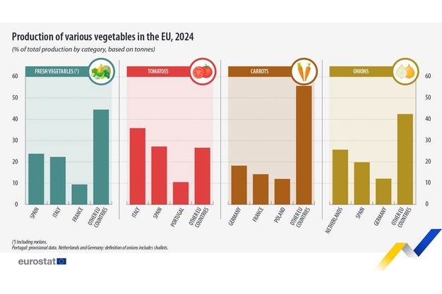 In 2024 steeg de geoogste productie van verschillende belangrijke groenten in de Europese Unie ten opzichte van 2023: de tomatenproductie was 5% hoger, de wortelproductie nam met 6% toe en de uienproductie groeide met 11% hoger. In de Europese Unie was Italië in 2024 de grootste producent van tomaten, goed voor 36% van de totale tomatenoogst, gevolgd door Spanje met 27% en Portugal met 10%.