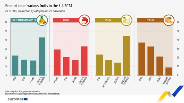 In 2024 bedroeg de productie van fruit, bessen en noten exclusief citrusvruchten, druiven en aardbeien in de Europese Unie 24,3 miljoen ton. Dit was 2% minder dan de oogst in 2023. De belangrijkste producenten van fruit, bessen en noten in 2024 waren Italië, Spanje en Polen, die samen goed waren voor 57% van de Europese productie.