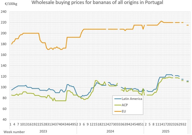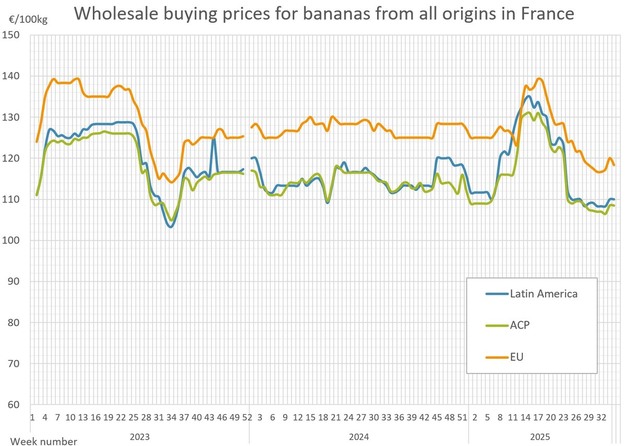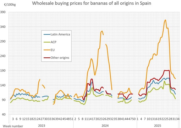 De groothandelsprijzen voor bananen in diverse Europese landen lieten een wisselend beeld zien tussen week 33 (eindigend op 17 augustus 2025) en week 34 (eindigend op 24 augustus 2025), volgens de meest recente marktgegevens.