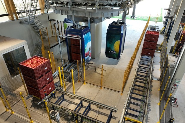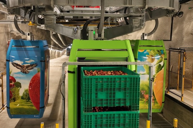 De pas geplukte appelen gaan nu per kabelbaan naar de opslag. Het kabelsysteem verbindt een van de pakstations van Melinda in Predaia met de ondergrondse cellen in de oude mijn van Rio Maggiore. Die liggen 900 meter vanaf de ingang, op circa 575 meter hoogte.