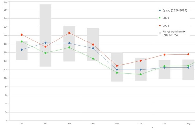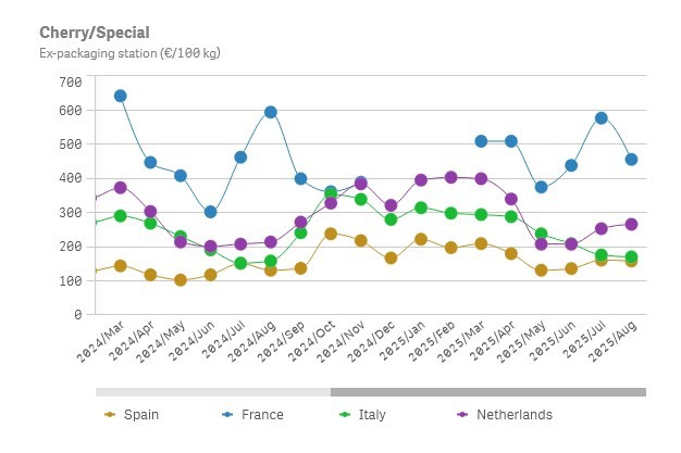 De hoge gemiddelde prijs betekent niet dat overal de prijzen op het tomatendashboard van de Europese Commissie groen kleuren. Vooral in de hoek van de cherry- en specialtytomaten valt op dat de prijs is gedaald in vergelijking met juli. Nederland is hier de uitzondering, met een gemiddelde kiloprijs van 2,62 euro. Een kiloprijs die 84% hoger ligt dan het vijfjarig gemiddelde en 23% hoger dan in augustus vorig jaar.