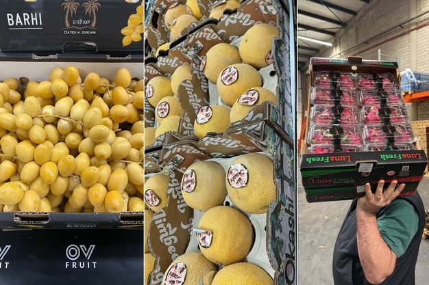 Egyptische Barhi dadels, Okashi meloenen van Spaanse herkomst en Turks dragonfruit