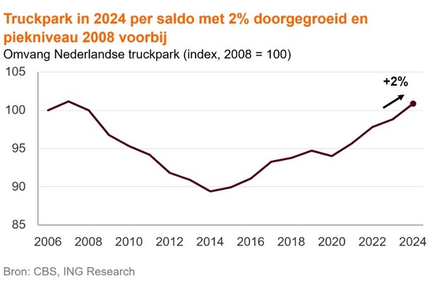 Terwijl de transportmarkt wisselend herstel laat zien, heeft het Nederlandse truckpark met 151.000 voertuigen een recordomvang bereikt begin 2025 (+2% in 2024).Dat blijkt uit een analyse door ING.