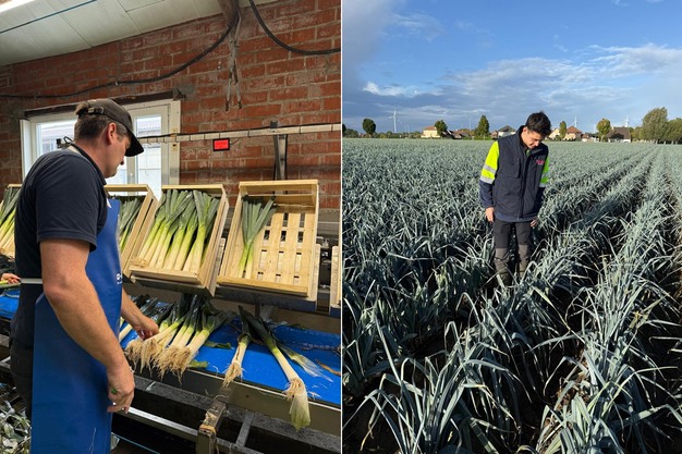 Links: een teler van Calsa die de prei klaarmaakt, rechts: jobstudent Aimé die mee ging naar het veld om de kwaliteit te beoordelen