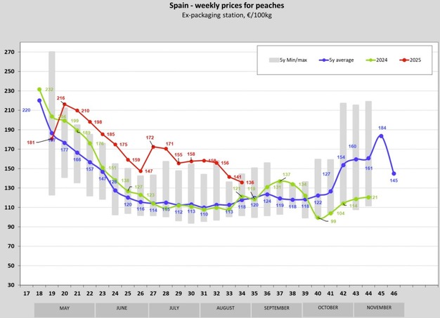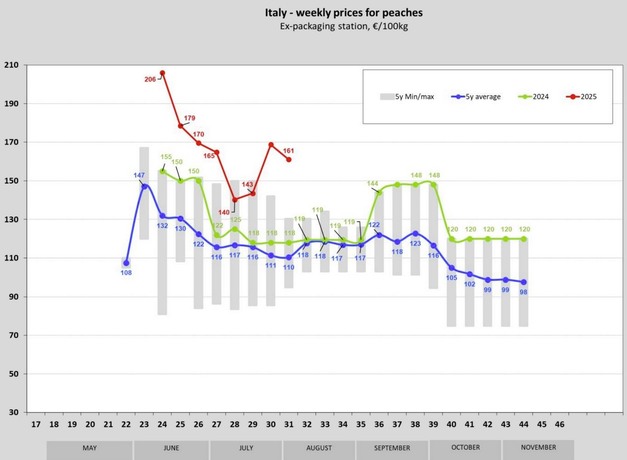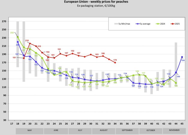 Gemiddeld daalden de perzikprijzen in de Europese Unie van €186 per 100 kg in week 32 naar €178 in week 33 en vervolgens naar €170 in week 34. Deze gestage daling over drie opeenvolgende weken benadrukt de seizoensgebonden invloed van het aanbod op de markt.