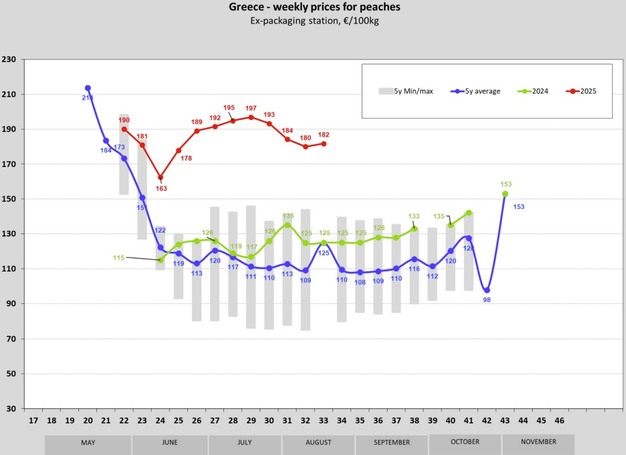 In de hele Europese Unie zijn de prijzen van perziken in augustus blijven dalen. De meest recente cijfers, van week 32 tot en met 34, tonen aan dat de prijzen in de meeste grote teeltlanden verder onder druk staan. Gegevens uit Spanje, Griekenland en het algemene EU-gemiddelde laten een verzwakking van de prijzen zien, hoewel Italië voor deze periode geen bijgewerkte cijfers rapporteerde.