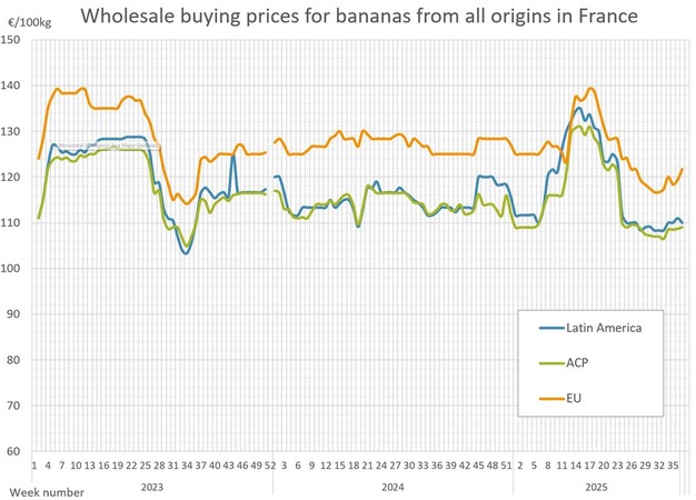 Tussen week 35 (eindigend op 31 augustus 2025) en week 36 (eindigend op 7 september 2025) lieten de groothandelsprijzen voor bananen in verschillende Europese landen een wisselend beeld zien. De noteringen in €/100 kg weerspiegelden uiteenlopende trends: terwijl in sommige landen de prijzen stegen, werden elders juist scherpe dalingen genoteerd.