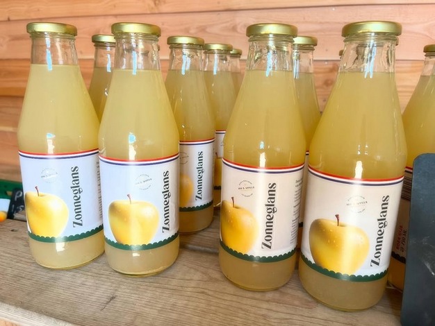 "Wat de Zonneglans extra bijzonder maakt, is dat deze appel na het snijden niet verkleurt, waardoor de appel ideaal is voor gebruik in salades. De smaak is verfrissend zoet met een aroma van citrus. Bovendien is deze appel ook geschikt voor mensen met een appelallergie. En het heeft ons echt verbaasd hoeveel mensen daar last van hebben, ook in onze eigen omgeving. Van heinde en verre komen ze er om! En de appels die niet voldoen aan de klasse I laten wij persen door Schulp in flessen met ons eigen etiket."