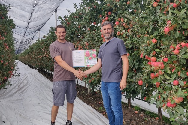Hans Goossens, Coördinator Nieuwe Fruitvariëteiten bij EFC (rechts), overhandigt de symbolische cheque van de hoofdprijs aan Florian Perathoner, KANZI®-teler in Zuid-Tirol (links)