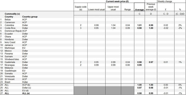 Deze week zien we op de Britse markt gemengde trends in de bananenprijzen bij de belangrijkste Latijns-Amerikaanse leveranciers. Colombia noteerde een bescheiden stijging, waarbij de gemiddelde prijs steeg van £0,99 (€1,14) per kilo afgelopen week naar £1,01 (€1,16) deze week, een stijging van £0,02 (€0,02) of 2%. Hiermee behoren Colombiaanse bananen tot de weinige met een positieve ontwikkeling op weekbasis.