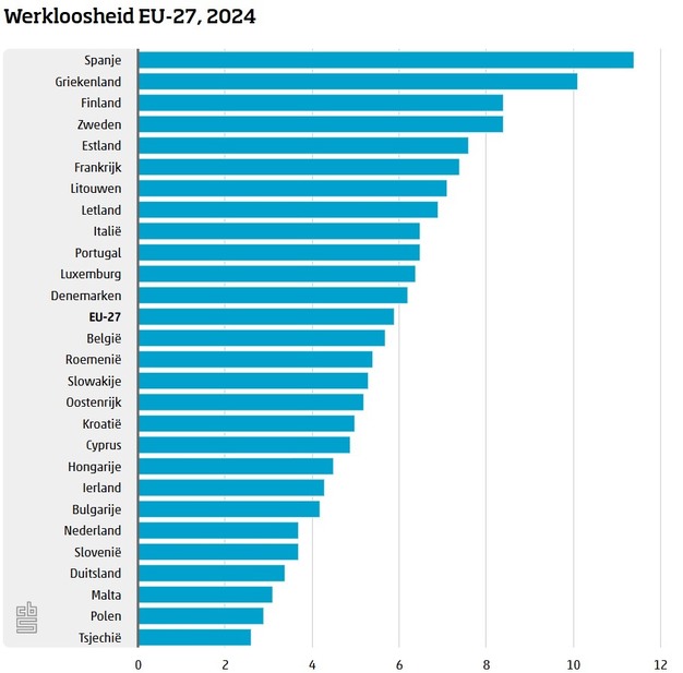 Ondanks de recente stijging blijft de werkloosheid in Nederland laag vergeleken met de rest van de Europese Unie. In 2024 bedroeg de gemiddelde werkloosheid in de EU 5,9 procent. Nederland zat daar met 3,7 procent ruim onder. Alleen Tsjechië en Polen kenden nog lagere percentages. Spanje (11,4 procent) en Griekenland (10,1 procent) noteerden de hoogste werkloosheid. Ook de arbeidsparticipatie in Nederland is hoog: in 2024 werkte 73,2 procent van de 15- tot 75-jarigen, tegen 61,7 procent gemiddeld in de EU.
