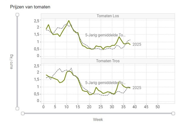 De tomatenprijzen zijn in week 38 licht gedaald: losse tomaten noteerden gemiddeld €0,814/kg (was €0,939), terwijl tros­tomaten daalden naar €0,936/kg (was €0,969). Dat blijkt uit de VBT-cijfers van deze week.