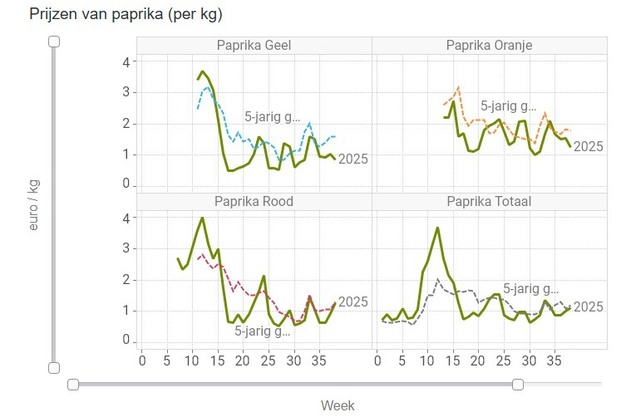 Gele en groene paprika's zien eveneens een prijsdaling. Gele paprika's daalden van €1,028 naar €0,859/kg en groene paprika's van €0,952 naar €0,854/kg. Rode paprika's stegen echter in prijs van €0,934 naar €1,274/kg.