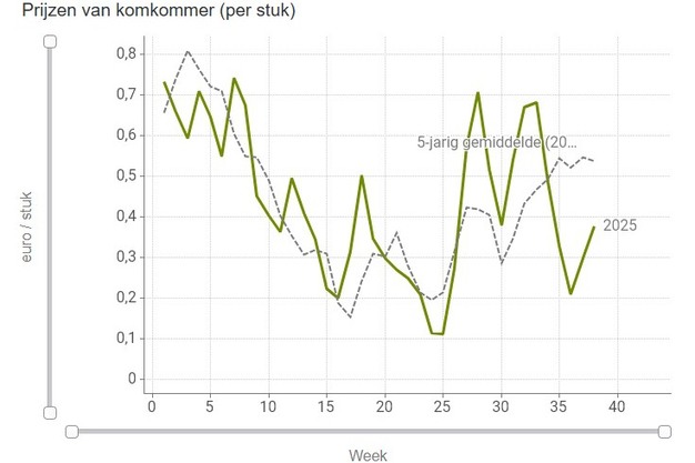 De komkommerprijzen blijven licht stijgen: van €0,298 per stuk naar €0,377.