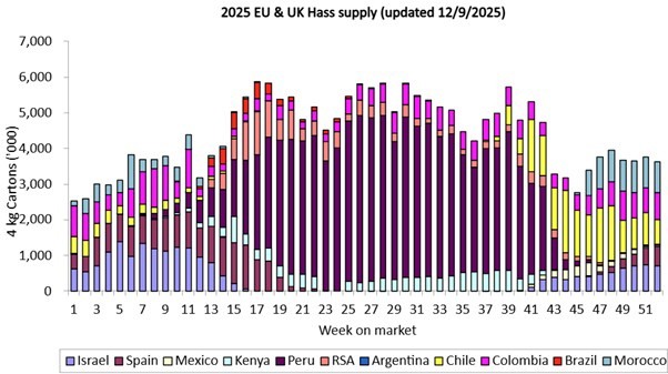 Zuid-Afrika bevindt zich nu in de laatste aanvoeringsperiode. "Een deel van de exportvraag wordt gedekt door het ras Lamb Hass, dat meestal later rijpt. Deze week wordt er fruit geoogst in de regio Kiepersol. We zijn tevreden over de aanvoer uit Zuid-Afrika dit seizoen, met consistente volumes gedurende het grootste deel van het seizoen. Over het algemeen zijn de planning en het transport goed verlopen."