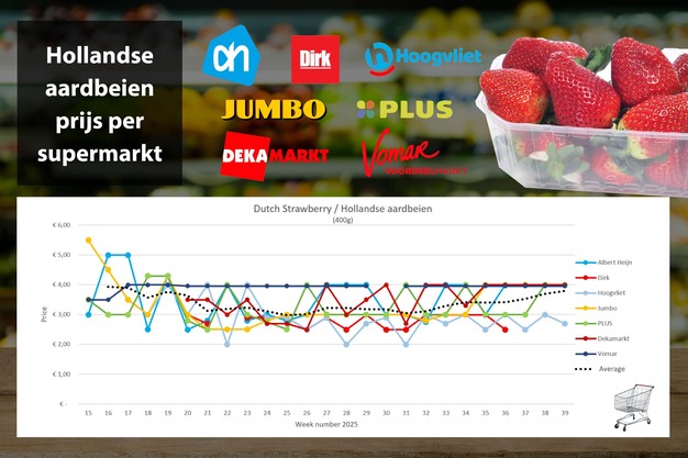 © Supermarktscanner.nl Bij Dirk ontbreken aardbeien voor de derde week op rij in het online schap. De andere supermarkten gaan nog wel door met aardbeien. Hoogvliet heeft zelfs een spotgoedkope aanbieding van 2,99 voor 2,49 per 400 gram en daarmee trekken ze de gemiddelde prijs 5 cent omlaag.