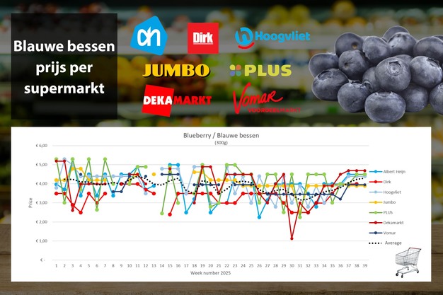 In week 39 heeft geen enkele supermarkt een aanbieding in blauwe bessen. Bij Dirk ontbreken ze in het online schap. De gemiddelde prijs komt daarmee 5 cent hoger uit dan in week 38: 4,32 euro per 300 gram.