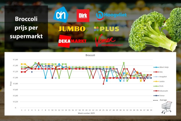 De gemiddelde broccoliprijs blijft in week 39 gelijk aan die van week 38 en er zijn weinig prijsverschillen. Bij Albert Heijn, Jumbo, PLUS en DekaMarkt kost een broccoli van 500 gram 1,09 euro, bij Dirk, Hoogvliet, en Vomar kost deze 99 cent.
