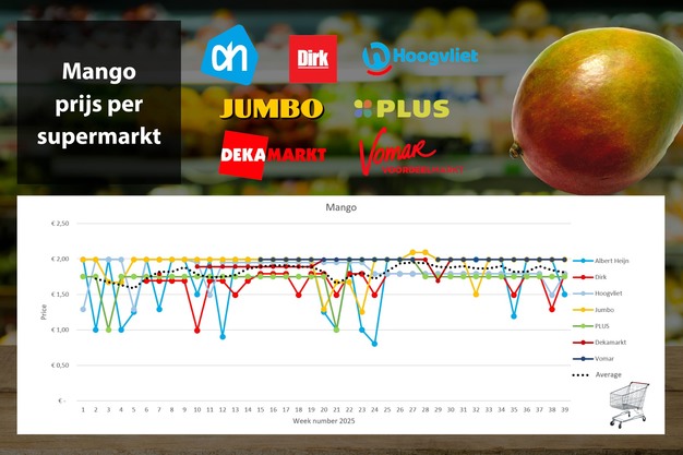 Albert Heijn zet mango in de picture met een aanbieding van 1,99 euro voor 1,50 euro. De aanbiedingen bij Dirk en Hoogvliet zijn voorbij. Dat betekent een plus voor de gemiddelde prijs van 4 cent.