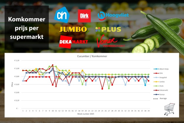 © Supermarktscanner.nl Weinig bijzonderheden in komkommer in week 39. Dirk heeft komkommer in de aanbieding en die bij Albert Heijn en Hoogvliet zijn voorbij.