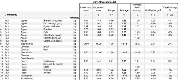 In de categorie steenfruit zijn de prijzen van Victoria-pruimen aanzienlijk gedaald. De gemiddelde prijs per kilo daalde van £2,14 (€2,44) in de voorgaande week naar £1,98 (€2,26) deze week, een verschil van £0,16 (€0,18) oftewel 7%.