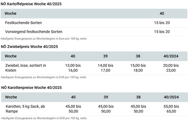 De wortelmarkt in Noord-Oostenrijk blijft stabiel en onveranderd ten opzichte van voorgaande weken. De oogstvolumes sluiten nog steeds goed aan bij de huidige vraag. De opslag in koelhuizen begint midden oktober. De telersprijzen zijn gelijk gebleven vergeleken met vorige week. Aan het begin van de week varieerden de prijzen voor wortelen in zakken van 5 kg, af helling, meestal tussen 45 en 50 euro per 100 kg, afhankelijk van de kwaliteit.