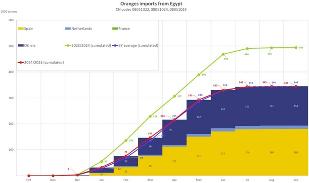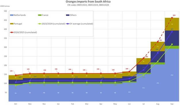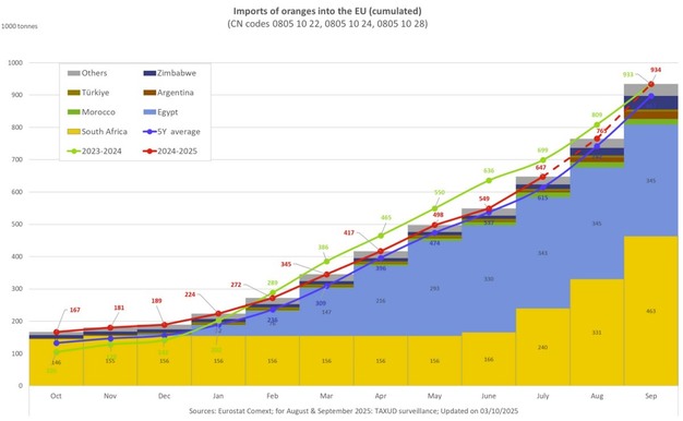 Tussen oktober 2024 en september 2025 importeerde de EU 934.334 ton sinaasappelen, bijna gelijk aan de 933.497 ton van het seizoen 2023/24 en iets boven het vijfjarig gemiddelde van 897.146 ton.