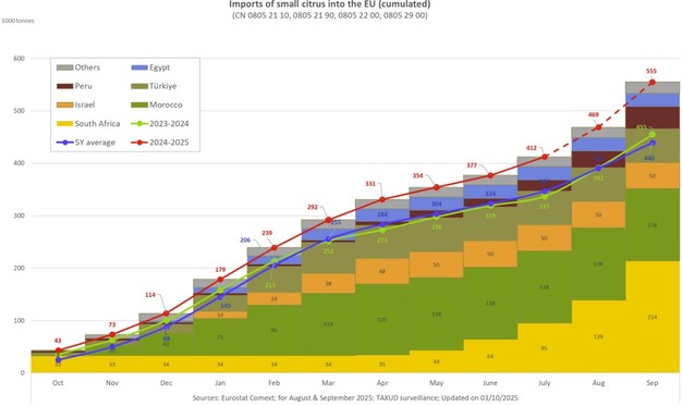 De citroenenimport in de EU bereikte 454.760 ton, hoger dan de 357.667 ton van 2023/24 en boven het vijfjarig gemiddelde van 410.947 ton. Zuid-Afrika leverde 229.641 ton, Turkije 101.823 ton en Argentinië 71.886 ton.