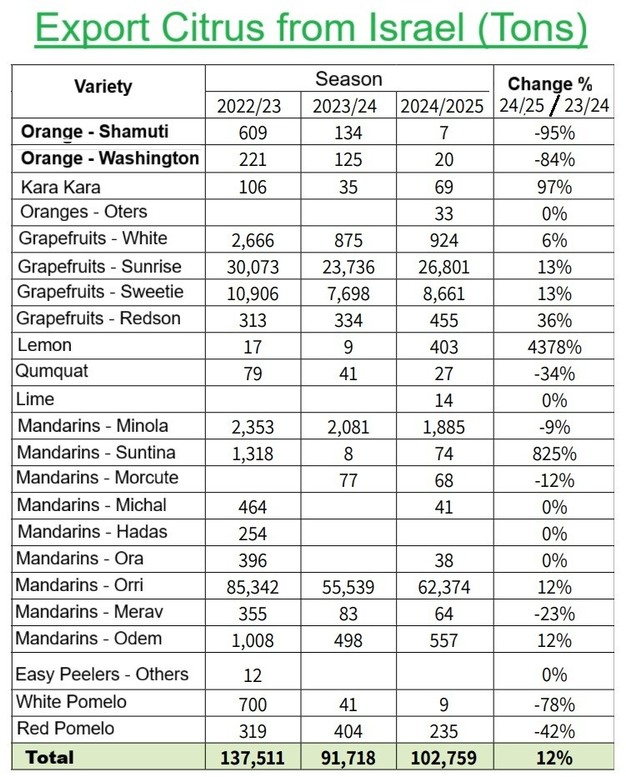 "Na een moeilijk seizoen 2023/2024, dat werd beïnvloed door regionale conflicten en personeelsgebrek, ziet de prognose voor de totale Israëlische grapefruitoogst er positief uit. Hoewel de officiële voorspellingen voor het exportvolume in 2025/2026 nog worden uitgewerkt, wijzen recente trends op een mogelijke stabilisatie of lichte stijging van de exportvolumes na de verwachte opleving in het seizoen 2024/2025. Ter referentie, de totale grapefruitoogst in het seizoen 2023/2024 werd geraamd op ongeveer 144.000 ton, waarvan circa 33.000 ton geëxporteerd werd."