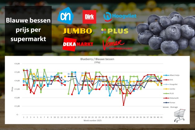 Blauwe bessen© Supermarktscanner.nl Wederom weer flinke beweging in de prijs voor blauwe bessen. Dirk en Plus bewegen omlaag. Plus heeft de allerlaagste prijs van 3,49 euro per 300 gram, gevolgd door Dirk met 3,69 euro. Jumbo gaat daarentegen flink de lucht in met de prijs, na de aanbieding in week 40 (van 3,89 naar 3,49 euro) veert de prijs op naar 4,49 euro, de prijs die Albert Heijn ook weer hanteert. Hoogvliet is ook terug op het oude niveau, van 4,39 euro.