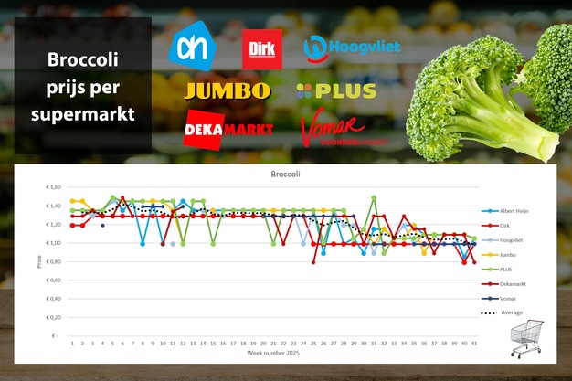 De lagere prijs van broccoli houdt stand in week 41. Met een aanbieding van DekaMark (van 1,09 voor 79 cent) en lichte prijsverlagingen van de landelijke supermarkten Albert Heijn, Jumbo en Plus (van 1,09 voor 1,05) blijft de gemiddelde prijs van broccoli net onder de euro.