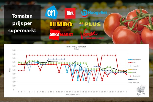 Op een aanbieding van Dirk na (van 89 voor 79 cent per 500 gram), blijft de prijs van trostomaten in week 41 stabiel.