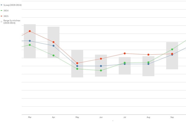 Op het tomatendashboard van de Europese Commissie valt verder op dat ook de tomatenprijzen voor losse tomaten en trostomaten in Nederland lager lagen dan vorig jaar. Losse tomaten leverden gemiddeld 94 eurocent per kilo op, 5% minder dan vorig jaar. Trostomaten wisselden gemiddeld voor 1,09 van eigenaar, 6% minder dan in september 2024.