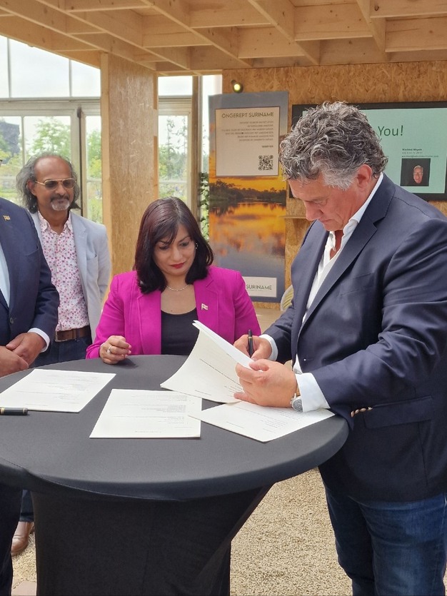 Kees Rijnhout en Rishma Kuldipsingh, de voormalige minister van Economische Zaken, teken het LOI-document op de Floriade
