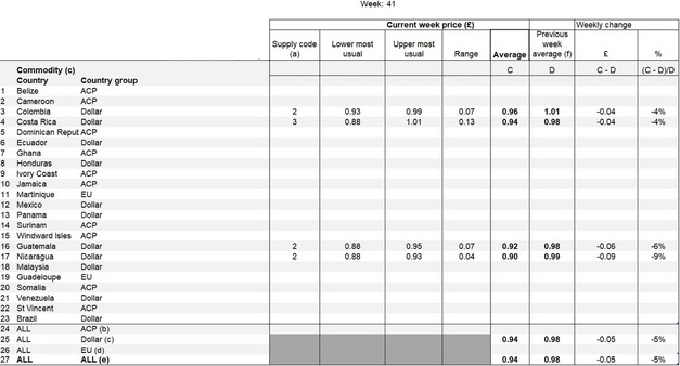 In Colombia bedroeg de gemiddelde prijs voor bananen £0,96 (€1,09) per kilo, terwijl dit de voorgaande week nog £1,01 (€1,15) was, een afname van £0,04 per kilo of ongeveer 4%. Voor Costa Ricaanse bananen was de gemiddelde prijs £0,94 (€1,07) per kilo, ten opzichte van £0,98 (€1,12) eerder, wat neerkomt op een daling van £0,04 per kilo.