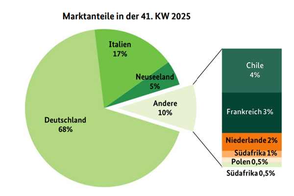 Het appelassortiment op de Duitse markt kende verdere diversificatie en werd versterkt door een bredere levering. In het binnenlandse aanbod waren Elstar, Boskoop en Jonagold leidend. Daarnaast groeide de aanwezigheid van Braeburn en Rubinette, terwijl ook de betekenis van Pinova en Gala toenam.